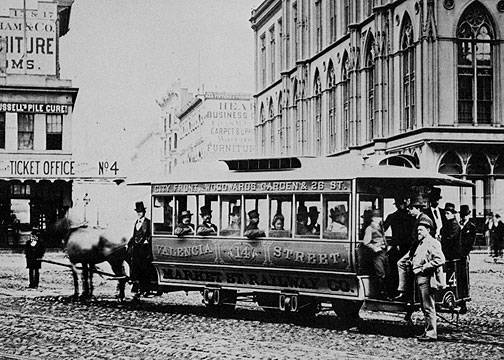 In San Francisco horsecar lines were crisscrossing the city by the 1860s. Here’s one of the first lines at Market and Post on its way to Woodward’s Gardens: