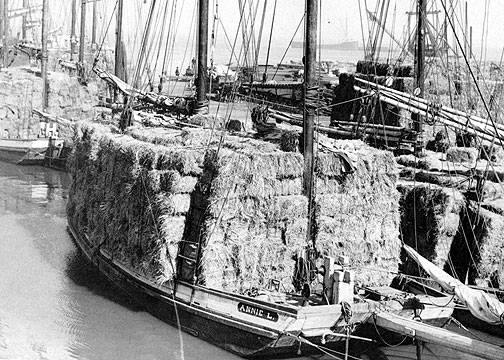 In the mid-1880s San Francisco needed 350 tons a day of hay and grain to feed its 23,000+ horses. Pictured here, the Annie L, a scow schooner typical of the era.