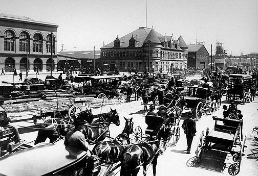 Horsecars line up at Ferry building in San Francisco, 1875.