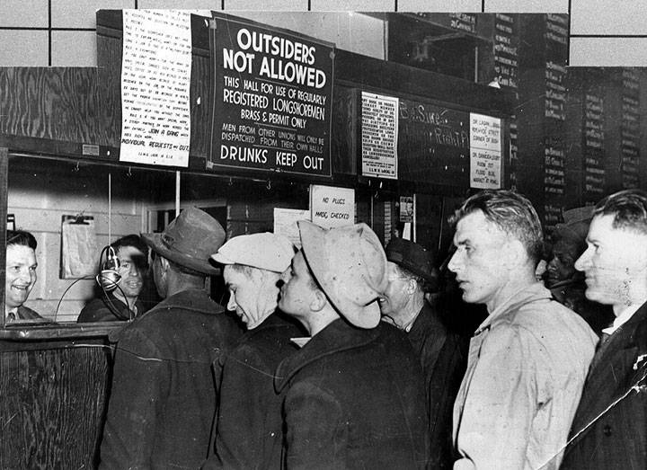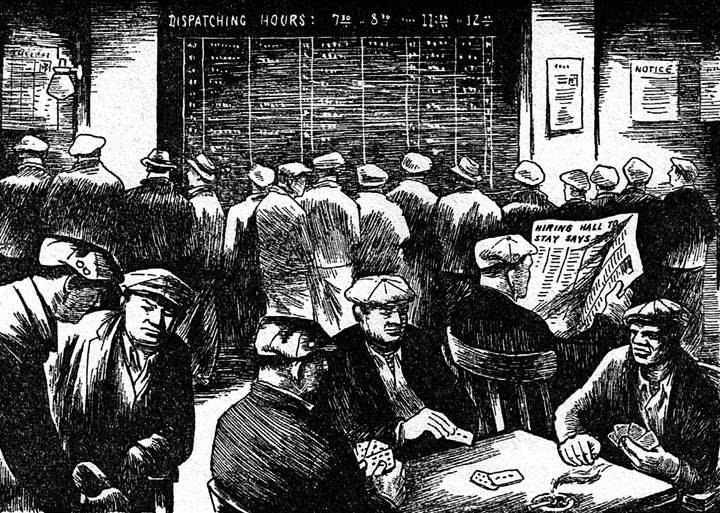 The Hiring Hall, as depicted by Bits Hayden in 1934, after end of Big Strike. Note newspaper headline about Hiring Hall winning permanence from arbitrator's decision.