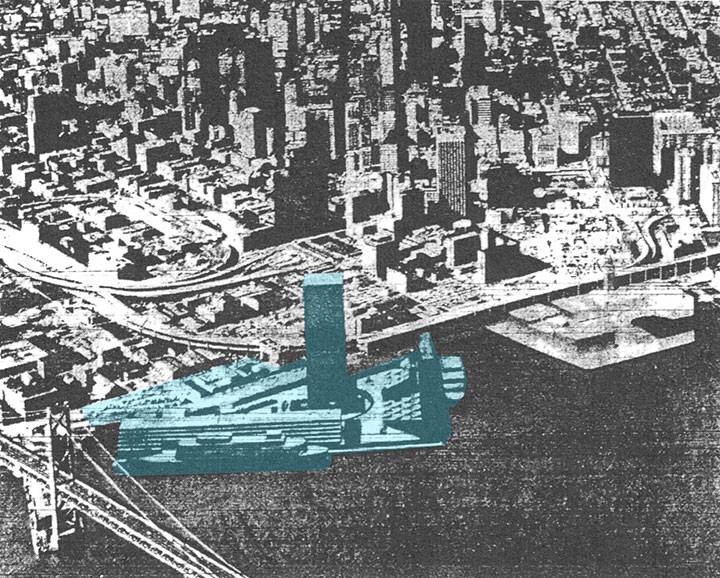 Proposed U.S. Steel skyscraper to be built in bay just north of the Bay Bridge, 1969.
