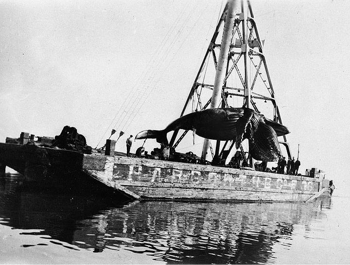 Whale Processed at Allen Seven Sons Plant, San Francisco. The bloody business of reducing complicated life forms into uncomplicated commodities was mostly accomplished at sea, but sometimes the whales were dragged into the bay relatively intact for processing.