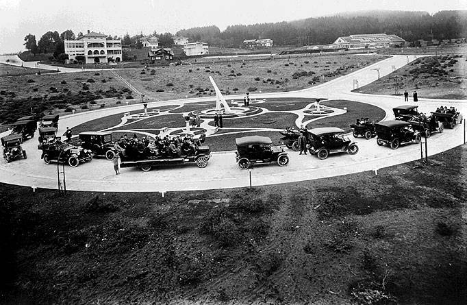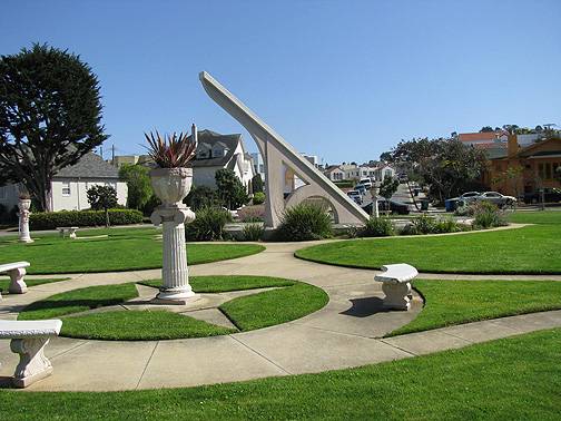 Whether or not you believe such theories, you'll have to admit that the Urbano Sundial is a bizarre, incongruous sight. When it was built, around the turn of the century, what is now the Urbano Street circle was the Ingleside race track, located in the wasteland of endless sand dunes that covered most of western San Francisco; the sundial, say historians, was erected as a race-track ornament. Later, as the city sprawled outward across the barren sands, the track was paved over, the bleachers were torn down, and the racetrack became a middle-class neighborhood. All that remains of the former racetrack is the mysterious sundial.
