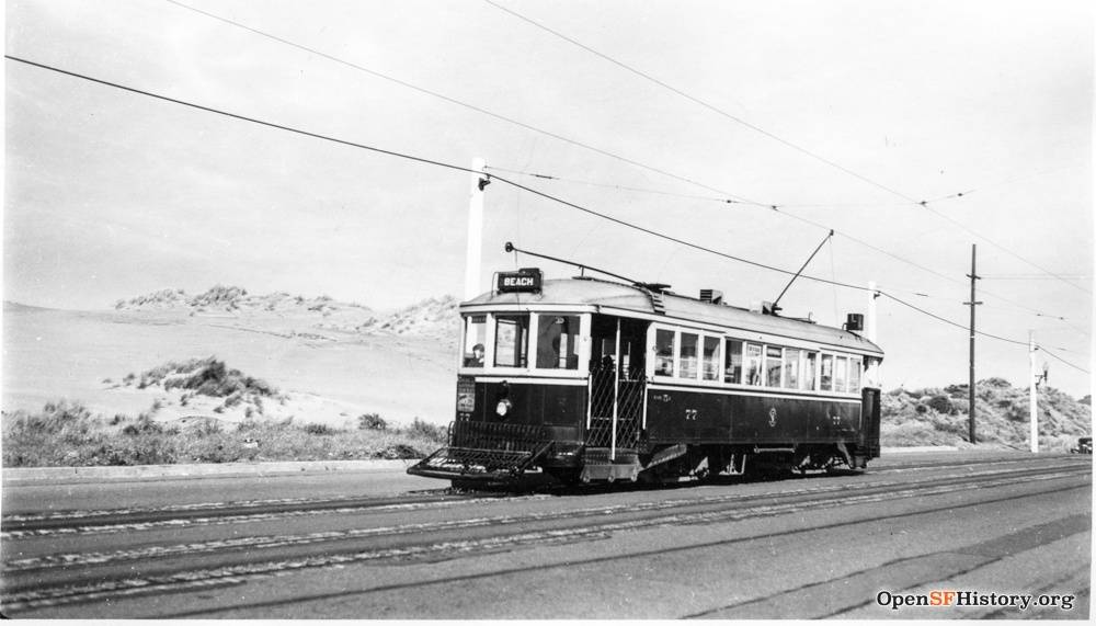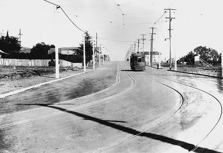 The L Taraval line ran through the sand dunes in the 1940s, here it is at 40th Avenue.