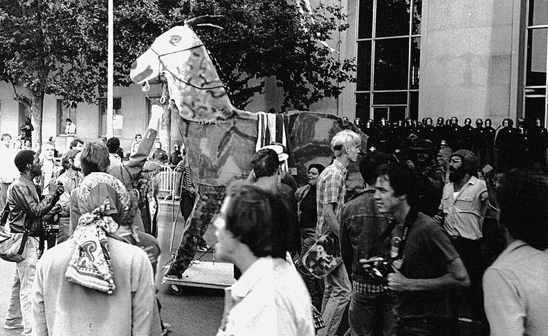 Trojan Donkey at the "protest pen" in front of the Moscone Center at the Democratic National Convention, 1984.