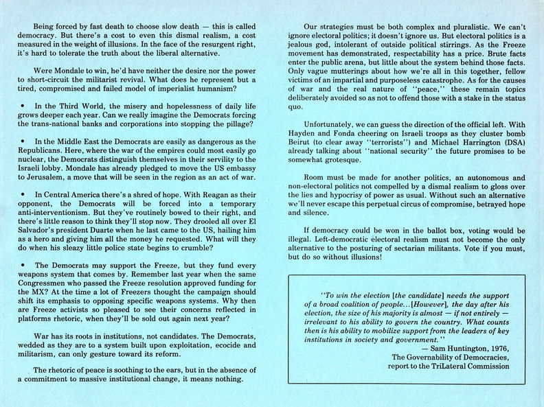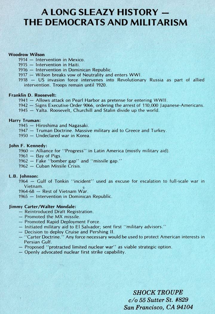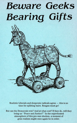 He was heartened to catch a glimpse of some friends from the End of the World's Fair prancing around a twelve foot high Trojan Donkey representing the Democratic Party. On one side some "civilians" fed the donkey ballots, money and a globe. Out the donkey's rear end, "soldiers" pulled out excreted missiles, tanks and skeletons. Others stayed at the perimeter of the skits and passed out a carefully written brochure for spectators titled "Beware of Geeks Bearing Gifts," with a hilarious cartoon of a hi-tech militarized Trojan Donkey with a Mondale face. The Kid found his people but was cursing himself for not being in Buzz's backyard on the weekend, helping him build this monster. The pamphlet was simple but radical, and aimed at a real audience: peace activists at the Democratic Party's periphery, never denying that Reagan's re-election would be particularly disastrous. The back of the pamphlet had a list of major military interventions and build-ups under Democratic administrations from Woodrow Wilson to Jimmy Carter. Buzz said the Donkey might show up again for the Rock Against Reagan concert on Thursday, if he wanted to help. . . . He began to look for people he knew, finally finding the Trojan Donkey crew.