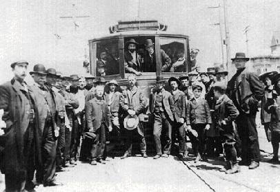 In this photo, Mayor Schmitz conducts the first streetcar ride after the 1906 earthquake. The Carmen (pictured) were among the most militant of San Francisco workers as they struck in five of the six years from 1902 to 1907, leading to the violent gunfight that erupted on Bloody Tuesday, May 7, 1907. Ten years later, carmen staged a wildcat strike for an 8 hour day and against the brutality of United Railroads.