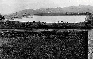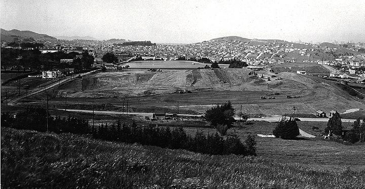 Municipal Reservoir at "University Mound" east of McLaren Park, seen here in the 1930s. Bernal Heights in middle right, Twin Peaks at left edge, even Mt. Tamalpais in Marin County is faintly visible on distant horizon left of center.