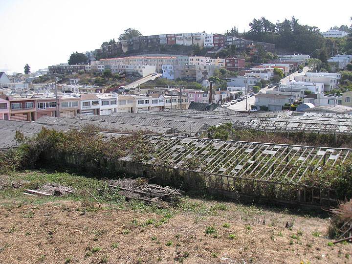 Once-thriving greenhouses near University Mound reservoir in Portola district.