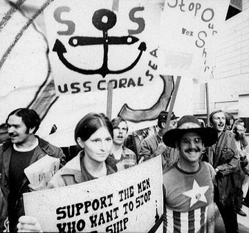 Demonstrators support Coral Sea sailors attempting to stop their ship from sailing to Vietnam.