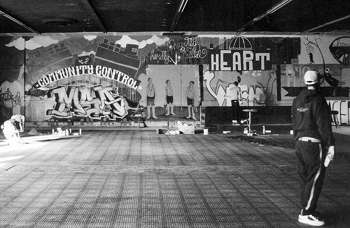 Now that we had succeeded, we found ourselves in the unexpected role of being the curators and administrators for perhaps the largest independent art venue in the city. In the months that followed, 949 Market would host ongoing tours of the murals, all night dance parties, punk shows, film festivals, and even the production of a queer porno movie. We started doing a Sunday Free Café—inspiration for the Streetopia Free Café—where coffee, bagels, fruit, and newspapers were provided for a diverse crowd of Mission artists and activists and Market Street homeless. A month after the first event, a couple of us in the core group—myself included—finally moved into 949 Market and started living there.