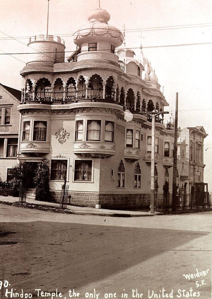 Without doubt the most awesome, the most spooky, the most spine-tingling curiosity in all Cow Hollow [was] that which frightened "most" of us kids "the most." I describe none other than the Vedanta Temple #1. Well I've always tried to forget it! Once during late afternoon services some fanatic set off a bomb, and the Swamie died a week later because of the trauma. Not even the biggest clown among us ever made jokes about its weird signs and magic symbols; not even the bravest among us ever died to trespass its haunted, threatening soil.