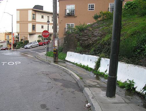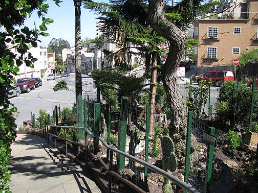 Just to its north are the Pemberton Steps, a lovely staircase that takes one up the hill to Graystone Terrace, a nice way to access Tank Hill from the south, across Clarendon Road (the other way to get to Tank Hill, with its spectacular views of the city, the Golden Gate and on clear days, Bolinas and Pt. Reyes, is by going to the very top of Shrader Street and turning left, walking to the end of the cul-de-sac and following the path out of the end past the wildflowers to the summit). The uppermost flight of the Pemberton Steps are still beautiful old stone, but the lower two flights were redone in the past few years, with pink cement and a water fountain. As is the case with most stairways in upper Eureka Valley, there are some amazing homes along the steps with gorgeous gardens and fantastic viewpoints.