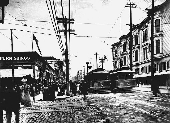 Fillmore Street, c. 1911, when it was the commercial hub of the city. Plans were drawn up in 1912 to tunnel beneath Fillmore Street to the Marina District, but the plan never came to pass. Note the Arches above the street.