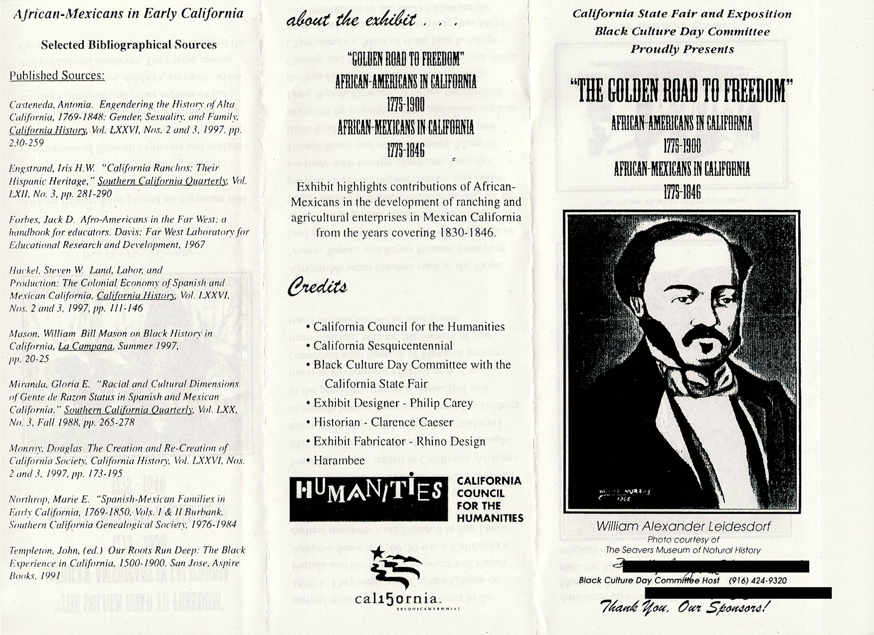 William Alexander Leidesdorff (1810-1848), was a native of the Danish West Indies and San Francisco's most prominent early Black citizen. Today a small alley in the downtown area is named for him. Arriving in San Francisco in 1841 as a ship's master from New Orleans, Leidesdorff immediately engaged in business, building a warehouse on what was then the waterfront at California and Leidesdorff Streets.