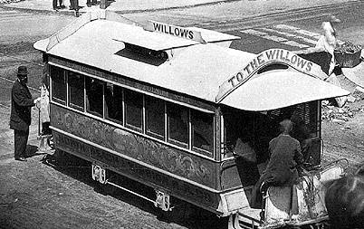 A horse-drawn omnibus near 2nd and Harrison, heading to the Willows in the 1860s.