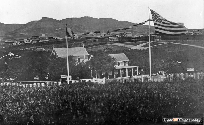The Willows, a popular resort "out in the country" in the Mission District, in the 1860s. It was near today's 18th between Valencia and Mission, and the willows of its name are growing around the now-buried Mission Creek.