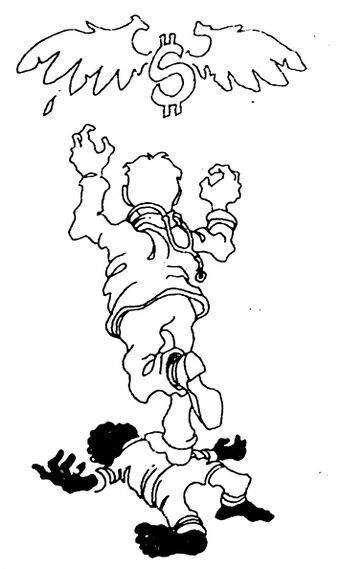We stand for the fundamental right to human health and wellbeing. The medicine for profit system—like the whole profit system of American capitalism—is based on injustice and exploitation. Our labor and our taxes give us inadequate to nearly non-existent services when we are sick and poorly paid jobs when we are well. Why? Because most of our money is gobbled up as PROFITS!! Therefore, we stand for the abolition of private profit in our health care system. The medicine for profit system should be replaced by a fully nationalized, community-patient-worker controlled system. By fully nationalized, we mean not only doctors or hospitals—we also mean all health-related profit-making "health" industries.
