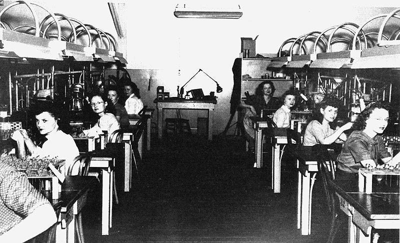 The interior of the building was interesting and fun to explore. We liked to look into the other departments, especially where the glass blowing was done. Almost all the assembly workers were women, or men over the draft age; all the glass blowers were men. One of the lady workers became hypnotized by the big press machine that she was operating and was injured. She was not severely hurt but we became aware of the studies and safety precautions that must be taken by manufacturers.