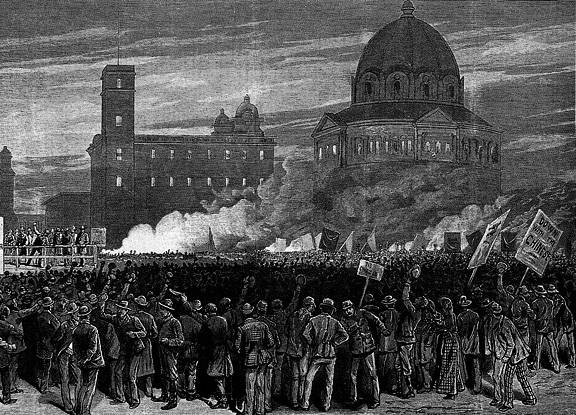 Rioting workers at site of Old City Hall, today's Main Library, in Civic Center