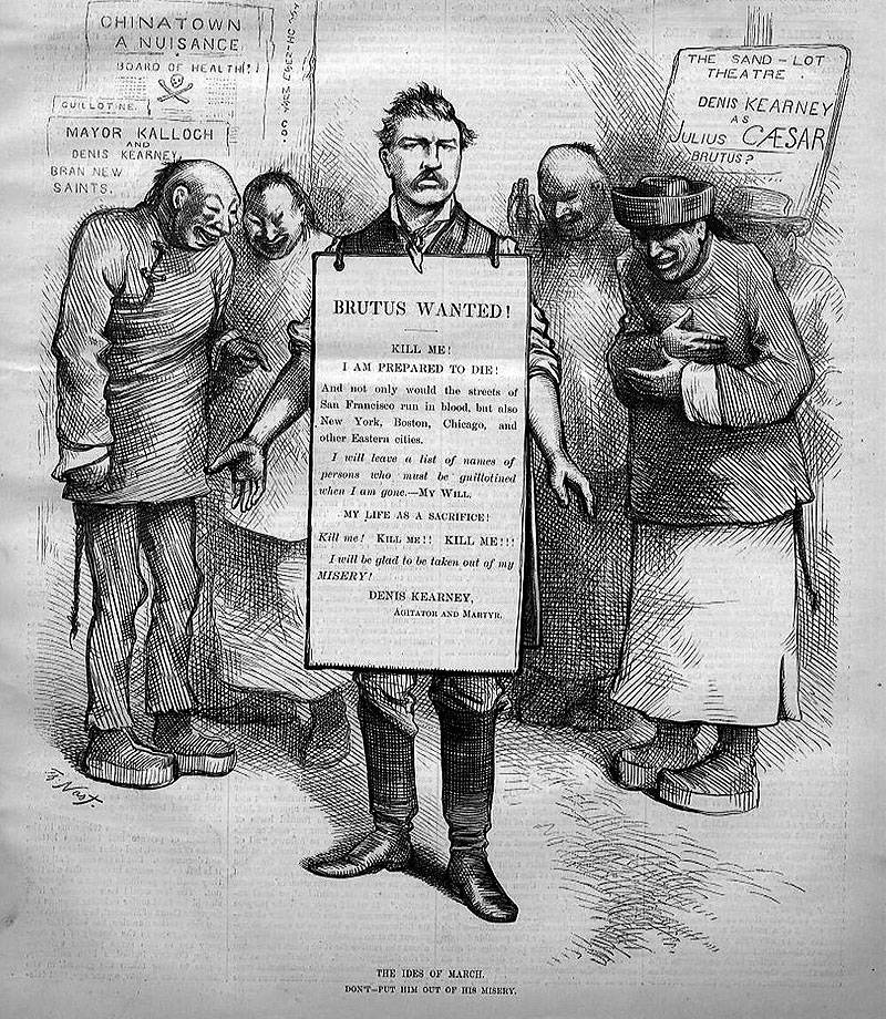 Kearney is taunted by caricaturized Chinese while he's incarcerated for inciting riots against the Chinese population...