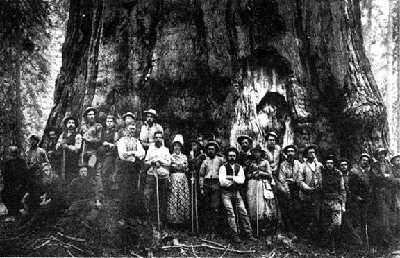 The members of the Kaweah Cooperative Commonwealth pose in front of the massive tree they named the "Karl Marx" tree around 1889. Today the same tree is a centerpiece of the national King's Canyon Park and is called the "General Sherman tree".