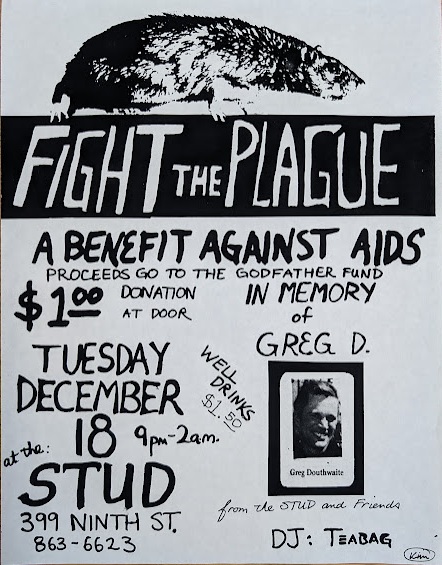1990 flyer for Godfather Service Fund: A benefit for the Godfather Service Fund, a San Francisco direct service program for people with AIDS. The benefit was held in honor of Stud bartender Greg Douthwaite, who had died the previous month.