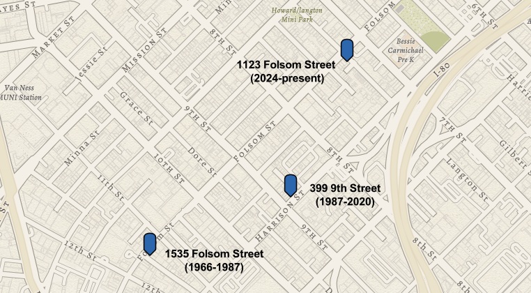 But the bar persisted. Over the years it has changed owners and locations more than once. By the mid-1970s Jim “Lady Edie” Fleckenstein became owner. A rent increase in 1987 prompted him to relocate The Stud to 399 9th Street, on the corner of 9th and Harrison. Upon his death in 1994 Fleckenstein left The Stud in the hands of his partner Larry “LaRue” Holloway and his accountant Ben “Fiesta” Guibord. Michael McElheney joined Holloway and Guibord as an owner in 1997; both LaRue and Guibord passed away in the following years. In 2016, when the landlord increased the rent at 399 9th Street, McElheney retired and turned ownership of the bar over to The Stud Collective, a group of nightclub professionals that now includes seventeen members. This group was initially organized as a worker-owned cooperative; by 2018 it was operating as a collective with employees. The Covid-19 pandemic closed The Stud in 2020 but the bar re-opened in 2024 in its third and current location at 1123 Folsom near 7th Street.