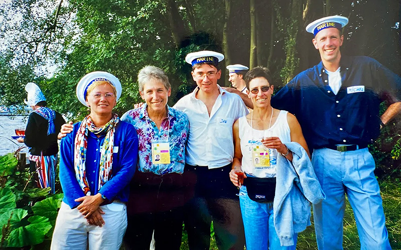 In Amsterdam the Dutch rowers greeted us in navy caps and with champagne. Nancy Stoller (L) and me with some of our hosts. 1998
