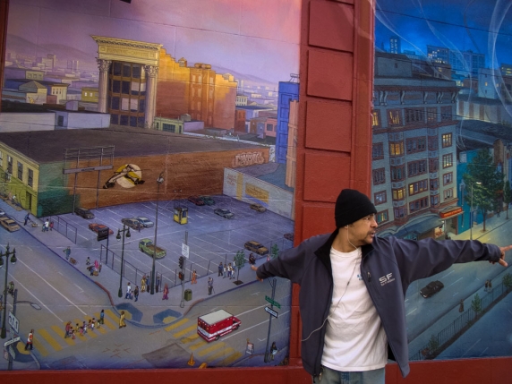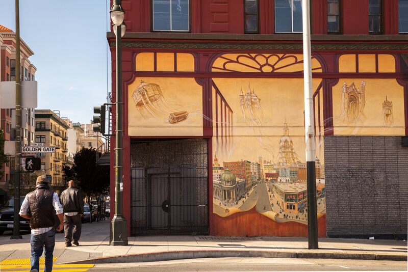 In this first panel of the mural, a fading gateway opens onto a bird's eye view of the mural's own location, looking North from an imagined viewpoint above Market and Jones Streets, one of the entry points to San Francisco's Tenderloin district. It is the very cityscape you walk through when approaching the mural.