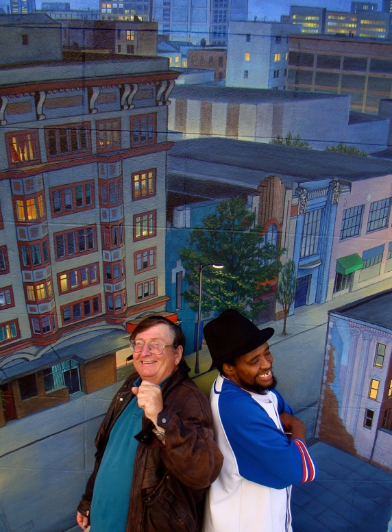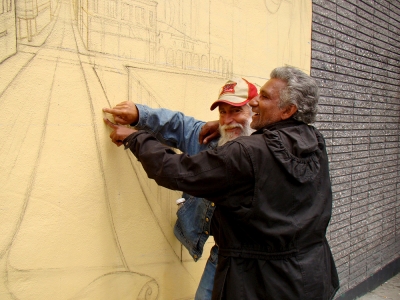 The street scene describes your environment as you look at the mural. Or rather, it is a record of the area surrounding the mural as it was in 2009-2010, when it was being painted. The area has undergone radical development since.