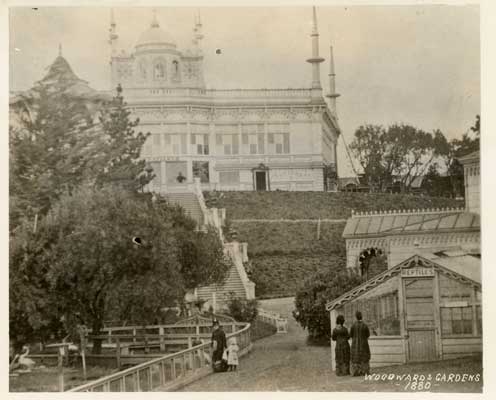 Woodward Gardens was a popular public amusement resort in operation between 1865 and 1891. It was formerly located within a two square block area bounded by Mission and Valencia, and 13th and 15th Streets. Wealthy hotel proprietor Robert B. Woodward bought the property in 1861, and moved his family into the former house of General Fremont that occupied the corner of Mission and 14th Streets. Over the next five years, he invested in beautifying the residence and grounds. A new main house was completed in 1862, and ornate fountains, lakes, and manicured gardens adorned the property.
