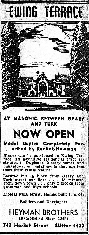 The Heyman Brothers Construction Company bought the land from the archdiocese in June 1938 for $150,000. Demolition began on Halloween 1938. On July 29, 1939 the first homes in what was called Ewing Terrace were being advertised for $7,950 and up. One of the amenities of the new homes was a glass enclosed interior patio that would allow sunshine, light and warmth directly into the homes.