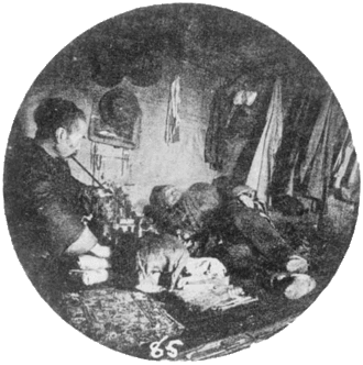 Police guides, moreover, were known for deploying quite brutal, invasive, and generally disrespectful tactics that included kicking doors open, forcing their way into private living quarters, waking people from sleep, and shining bright lights into people's faces. Whether these encounters were staged or not, they made violence an expected part of the tourist experience in Chinatown. Local photographers capitalized on these expectations and sold souvenir photographs that claimed to "show the Chinaman taken by surprise, as the flash light illuminates his den." Photographer Henry R. Knapp packaged his series of such images in a three-inch square booklet, which made them easily portable and well suited for carrying in one's pocket or purse. The scenes he captured and captioned included the expected "Opium Den" and "Filling Opium Pipe," but the inclusion of "Old Blind Chinese Woman, Aged 77" and "Trimming His Corns" disclosed tourists' appetite for being let into private moments, not just vicious ones.(18)
