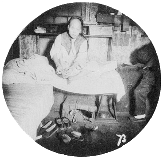 Long-time San Franciscan Charles Warren Stoddard told a story of how when his "‘special,' by the authority vested in him" demanded admittance to a particular closed door, "a group of coolies" who lived in the vicinity and had followed the tourists tried to divert his attention by assuring him that the place was vacant. The officer refused to leave, decided to employ force to open the door, and when he did, succeeded in revealing four sleeping men, "packed" into what Stoddard described as an "air-tight compartment" and "insensible" to the "hearty greeting" the tourists offered. W H. Gleadell related invading the living quarters of an impoverished Chinese couple—upon his police guide's instruction—in order to be able to take in such a scene firsthand. The officer enticed him with the statement, "'Now, if you would really wish to see how some of the lower class of Chinese live, this is not a bad place for the purpose. Go down that stair, push open the door at the foot, and walk right in.'" Armed with his guide's permission and his own sense of entitlement, Gleadell persevered. He came upon a room in which he was "just able to stand upright" and "with the exception of a stove in one corner" and some straw matting that "answered the purpose of a bed" was otherwise "quite destitute of furniture." At "one end crouched a man, while a woman sat in the centre, and a wretched little cur groveled between them." Then, "after a general survey"—complete with commentary on the "loathsome squalor" of Chinatown that was so typical of the tourist literature—Gleadell inquired, "Who lives here?" The man replied simply, "Me, wife, and little dog."(19)