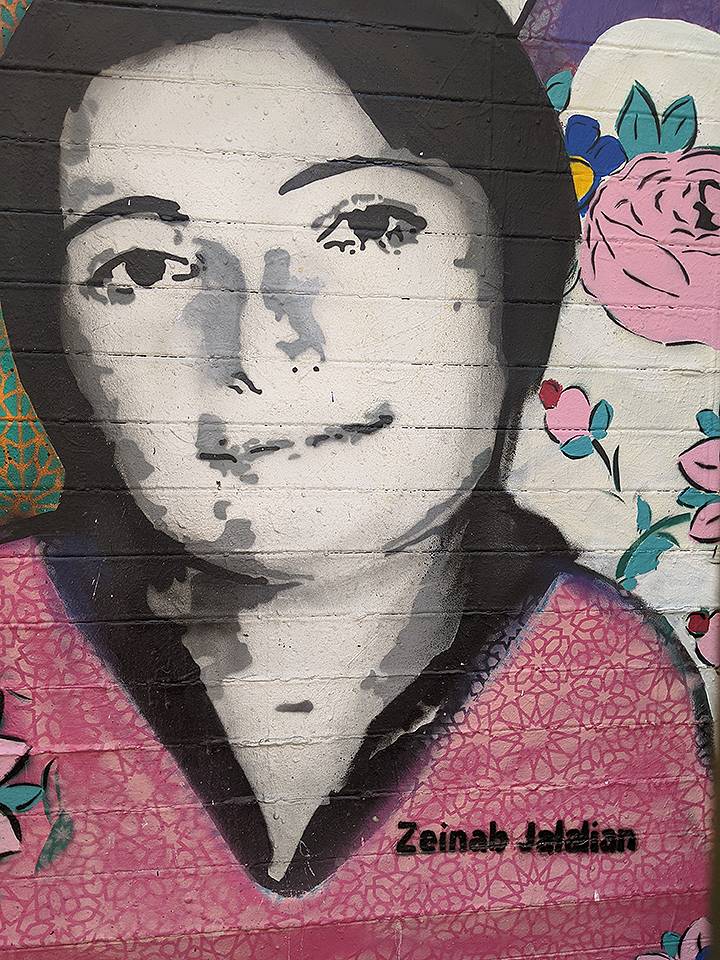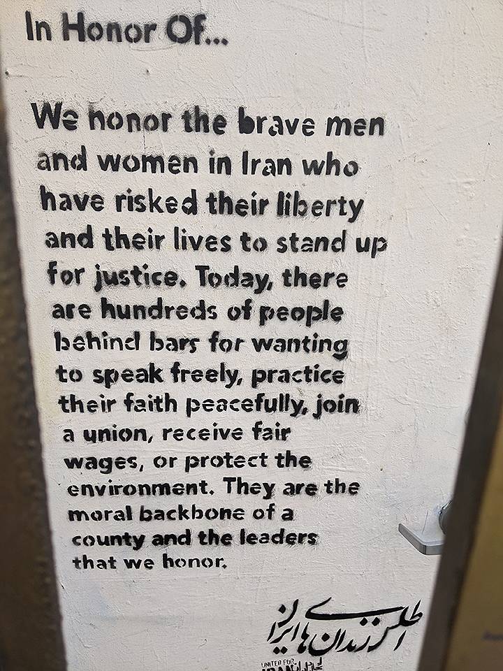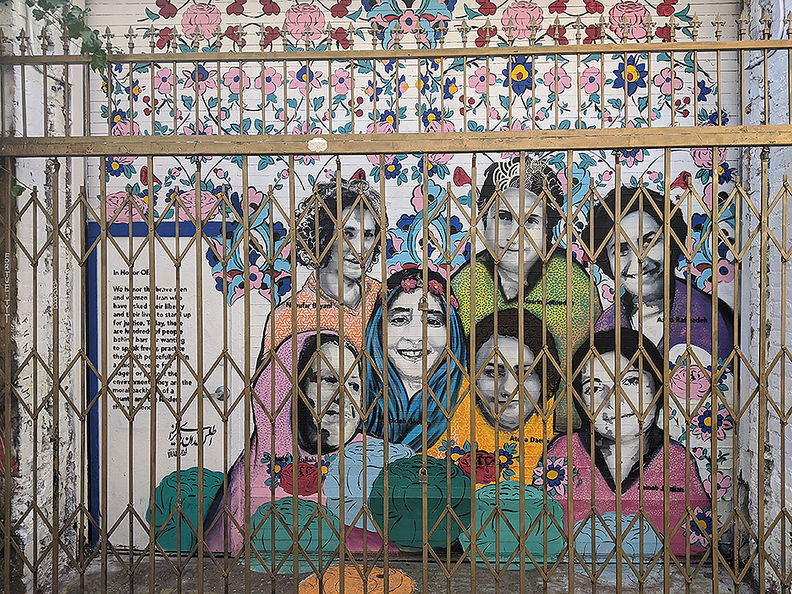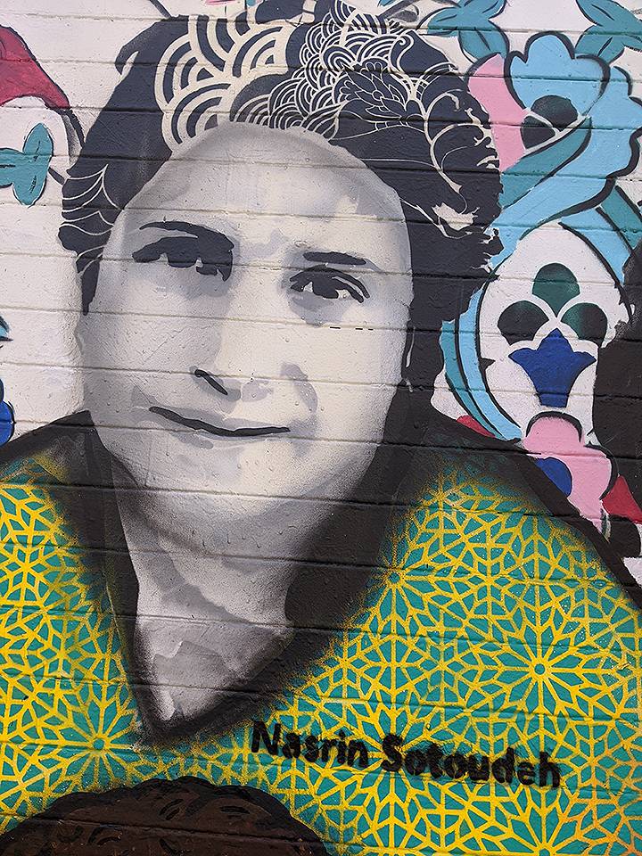 "United For Iran" (artists Keyvan Shovir and Shaghayegh Cyrous) painted a mural in Clarion Alley depicting seven women prisoners of conscience held by the Iranian theocratic regime who are/were being held in Iran. Since its original painting in 2019, three of these women have been freed, but the rest remain behind bars, where the mural aptly sits on the alley—behind a sliding metal gate painted gold. This mural also represents a decades-long history of Iranian activist solidarity in San Francisco.