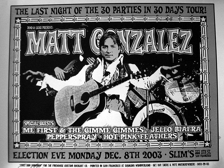 The Gonzalez campaign successfully tapped into the euphoric moment, and its extraordinary community-building potential. It almost shattered the cliché of the apathetic electorate, and it almost smashed Democratic Party machine politics into a million pieces. What an upset a win would have been! The news would have been easily as big Gavin Newsom’s savvy playing of the gay marriage card, and far more terrifying to the national Democratic Party leadership than Ralph Nader ever could be.