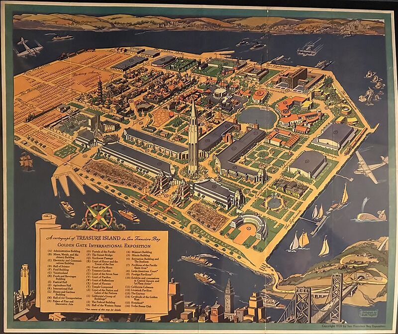 “Copies of this map, on heavy paper, suitable for framing, inserted in closed tube, 15 cents. Folded, ready for mailing, 10 cents. Available at Crocker stands on Treasure Island, at newsstands, or by mail. For mail order-add 3 cents. Address The Crocker Company, 720 Mission Street, San Francisco, California.”