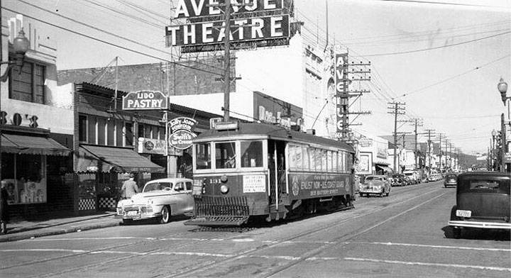 Avenue Theatre with H-line streetcar on San Bruno Avenue, 1947.