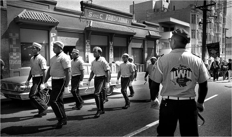 ILWU Drill Team marches near Dolores and Market in support of the UFW Boycott, 1968.