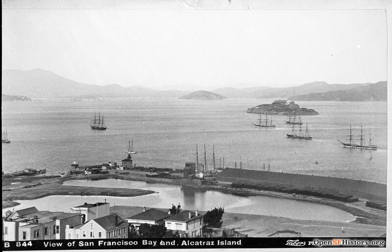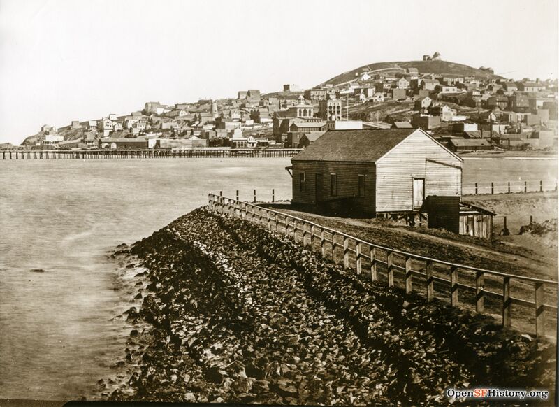 Meiggs Wharf, seen in this photo from the slopes of Telegraph Hill extending northward into the bay sometime between 1865-1875, started from the corner of today's Powell and Francisco Streets, now many blocks from the shoreline.