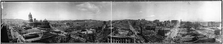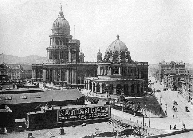 "The first 'city hall,' before 1840 was an office in a house, or the back room of a hotel which was moved around a lot because of fires and political corruption. By 1869, after a severe earthquake and with a constant influx of people, anyone with a stake in the future of San Francisco wanted to build a spectacular metropolis. So of course they needed a grand city hall. The new city hall was designed as a complex of buildings to be built on a triangular park, the former site of an old cemetery. The state appropriated the land and auctioned off portions of the property--the scheme was to raise a million and a half dollars for construction costs, and get it built in three years. Construction began in 1870, was finished 27 years later, in 1897, and cost six million dollars. Just nine years later it was all but destroyed by the earthquake and fire of 1906. It was a nineteenth-century thing; you give a contract to friends, or friends of friends. With seven chief architects, over twenty-seven years there was ineptitude after ineptitude. The materials were compromised; even the cast bricks were rumored to be shoddy. Fireplaces were built and later heating systems were installed. There were major sewage problems, the place was said to stink all the time. The floors didn't match up, chimneys didn't draw so the rooms were smokey, it was a mess. . . .