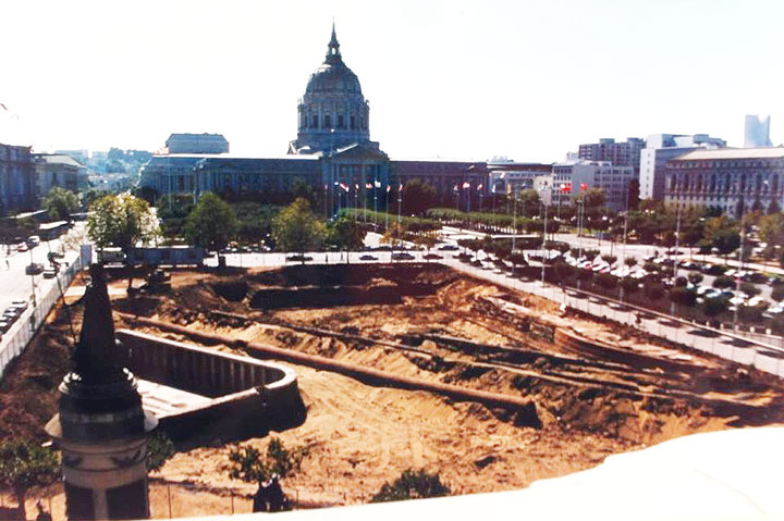 Old City Hall foundation, with Pioneer Monument at its former location at corner of 8th/Hyde/Market.
