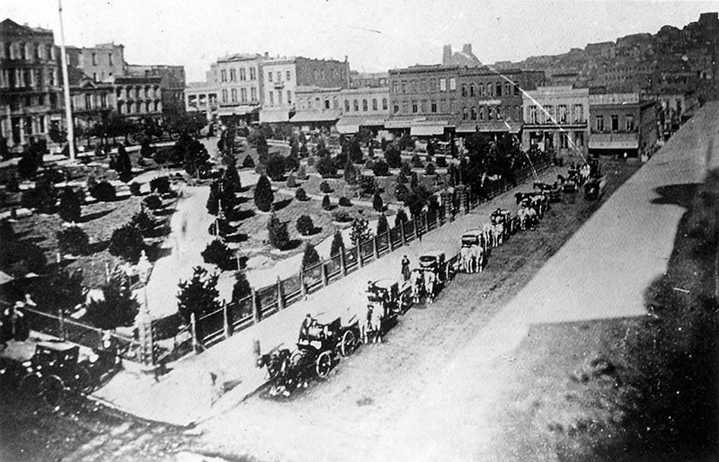Portsmouth Square, Kearny in foreground, Washington Street running east/west along plaza.
