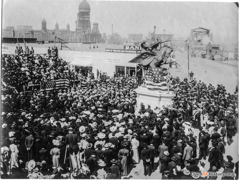 Inauguration of the "California Volunteers" Monument at Market and Van Ness, August 12, 1906, just a few months after the earthquake and fire had devastated this part of the city.