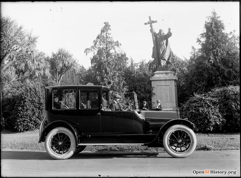 Statue of Junípero Serra, 1920s, with limousine.